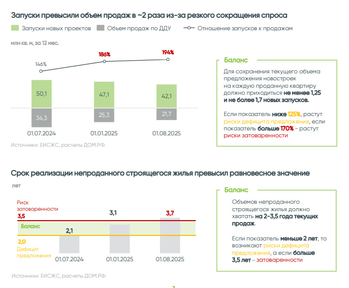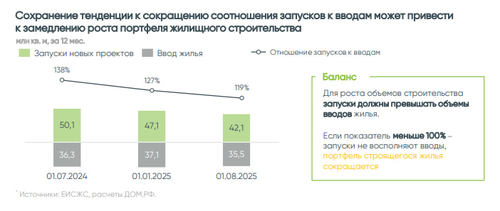 Дом.рф отмечает, что за 7 месяцев текущего года продажи в новостройках сократились сильнее (–23% год к году), чем запуски новых проектов (–19% год к году), что создает риск затоваренности рынка.