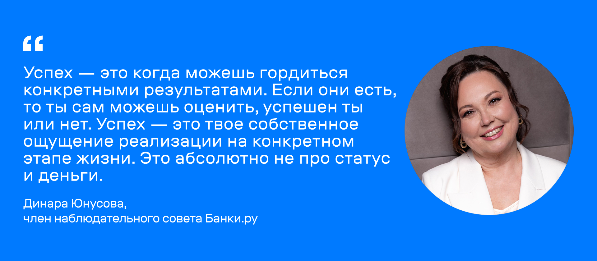 В рубрике «Диалог с...» мы публикуем интервью с людьми, которые создают Банки.ру. Надеемся, что этот цикл бесед позволил лучше узнать, кто развивает наш маркетплейс. Эта рубрика точно не будет полной без разговора с Динарой Юнусовой, бывшим генеральным директором Банки.ру, а сейчас — членом наблюдательного совета компании. Она рассказала, почему обязательно стоит писать отзывы и что для нее истинный успех.
