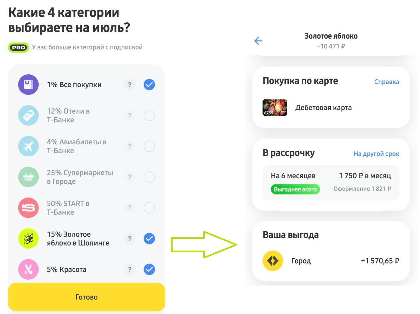 Шаг шестой: банковская категория кэшбека. В Т-банке шопинг в Золотом яблоке выпадает не каждый месяц, к сожалению, но в нужный месяц мой банк предложил мне 15% кэшбека на покупки в Золотом яблоке в списке категорий кэшбека месяца. Заявлено, что кэшбек работает при покупке в системе город, но когда я перешла по ссылкам в сторис в мобильном приложении, то, нажав на продукт, меня перебросило в мобильное приложение Золотого Яблока. Так что делаю вывод, что тут важна прямая покупка с карты Т-Банка в магазине Золотого яблока.