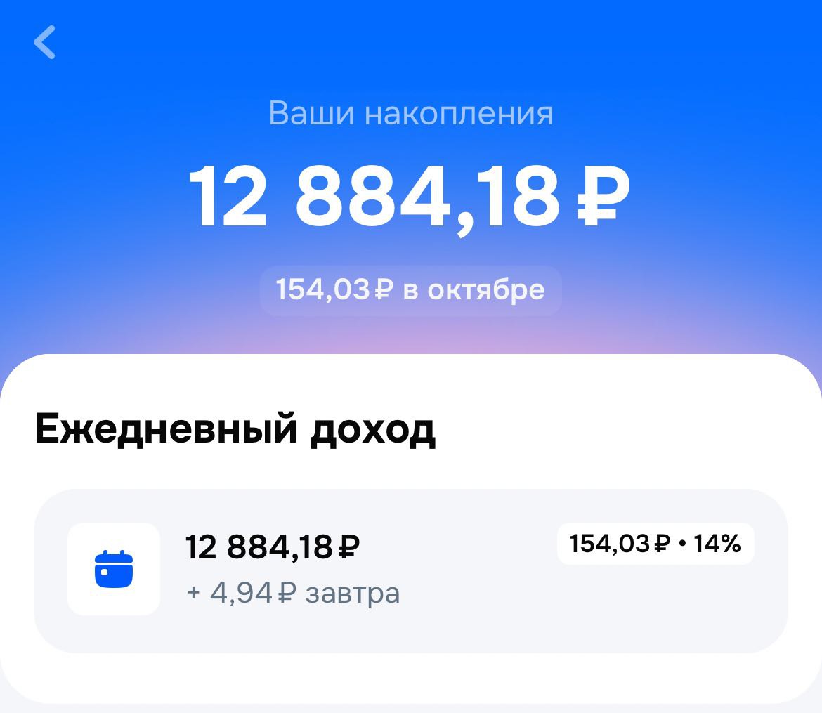 Накопительный счет открыт у меня в ОЗОН с ежедневной капитализацией. Как уже писала в последних постах, стараюсь откладывать суммы побольше, чтобы скорее снизить финансовую нагрузку. Вчера отправила на счет сумму 2450 руб. Итого сейчас на балансе 12884 руб.