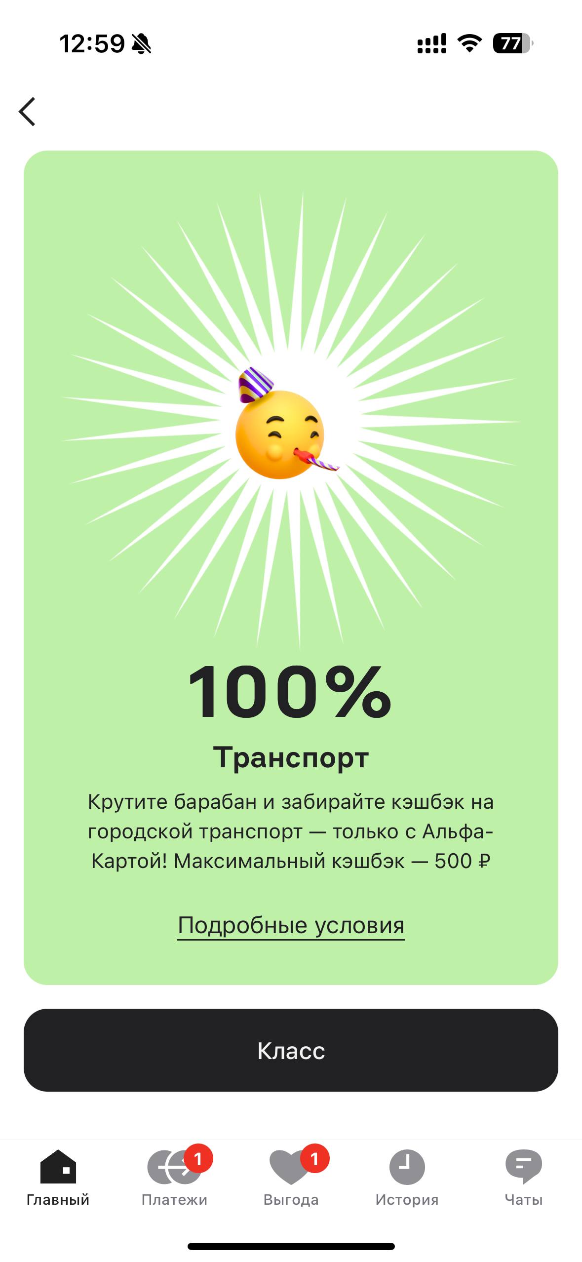 Зайдите в приложение банка и перейдите в раздел "Альфа-Выгодно" и кликните на баннер "Суперкэшбэк на транспорт". Покрутите барабан и узнайте, какой процент кэшбэка предлагает вам банк. Данный кэшбэк будет действовать в течение недели - с 13.10.2025 до 19.10.2025. В следующий раз барабан можно будет покрутить на следующей неделе с 20 по 26 октября. Выпасть может любой кэшбэк от 30 до 100%.