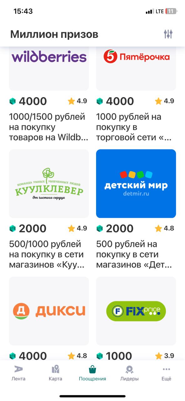 За участие в голосованиях и заданиях начисляются баллы, которые можно обменять на сувениры проекта, городские услуги, развлечения, билеты в театры и музеи, пополнение карты «Тройка», оплаты услуг парковочных сервисов, каршеринга и велопроката, а также можно направить их на благотворитель-ность. Раз в неделю я обмениваю необходимое количество балов на купон в магазин Пятерочка, Дикси или Авоська, обычно на 500 руб., и иду отовариваться, что несомненно радует и меня и мой кошелек.