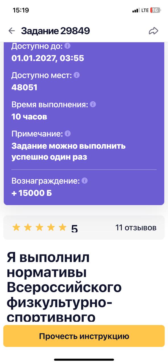 Пример задания - сдать нормативы ГТО, и получить сразу 15.000 баллов (примерно 3 750 руб).