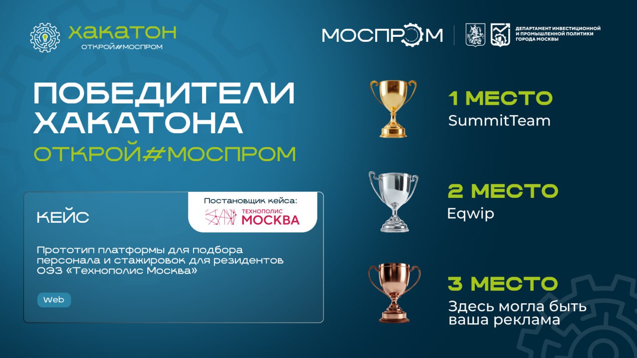 С 17 по 19 октября SummitTeam, состоящая из нескольких разработчиков нашей группы компаний, приняла участие в хакатоне «Открой#Моспром», организованного Департаментом информационной и промышленной политики Москвы. И заняла 1 место среди 24 команд в номинации по созданию лучшей платформы подбора персонала и стажировок для резидентов ОЭЗ «Технополис Москва».