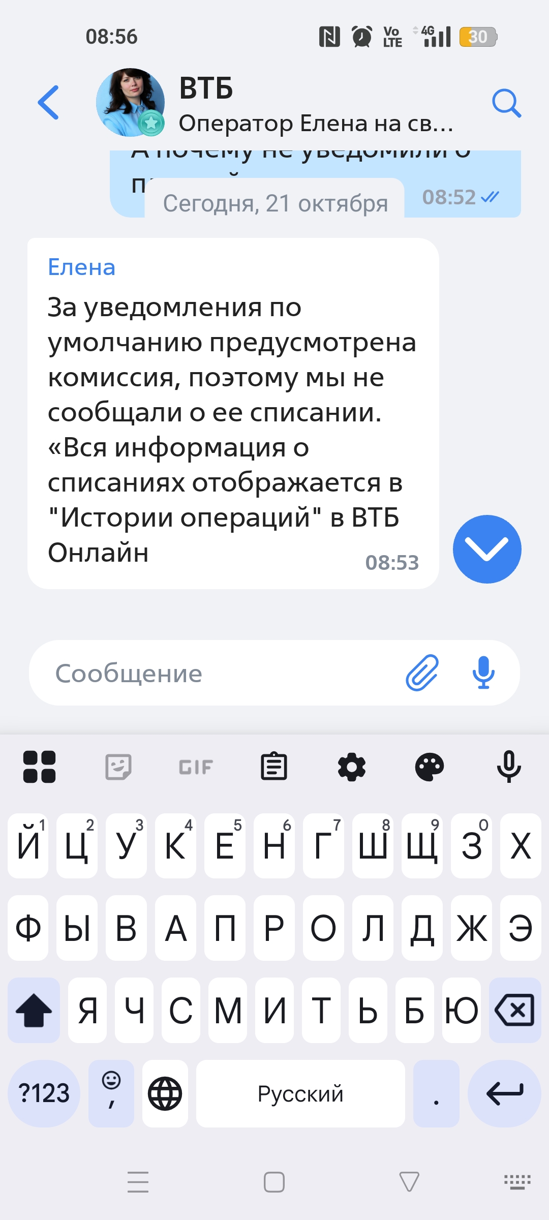 Ленусик11,совершенно верно. Но вы же получали уведомления от ВТБ ПОСЛЕ КАЖДОЙ ОПЕРАЦИИ. Я эту услугу , у себя СРАЗУ отключил и она МНЕ не нужна
