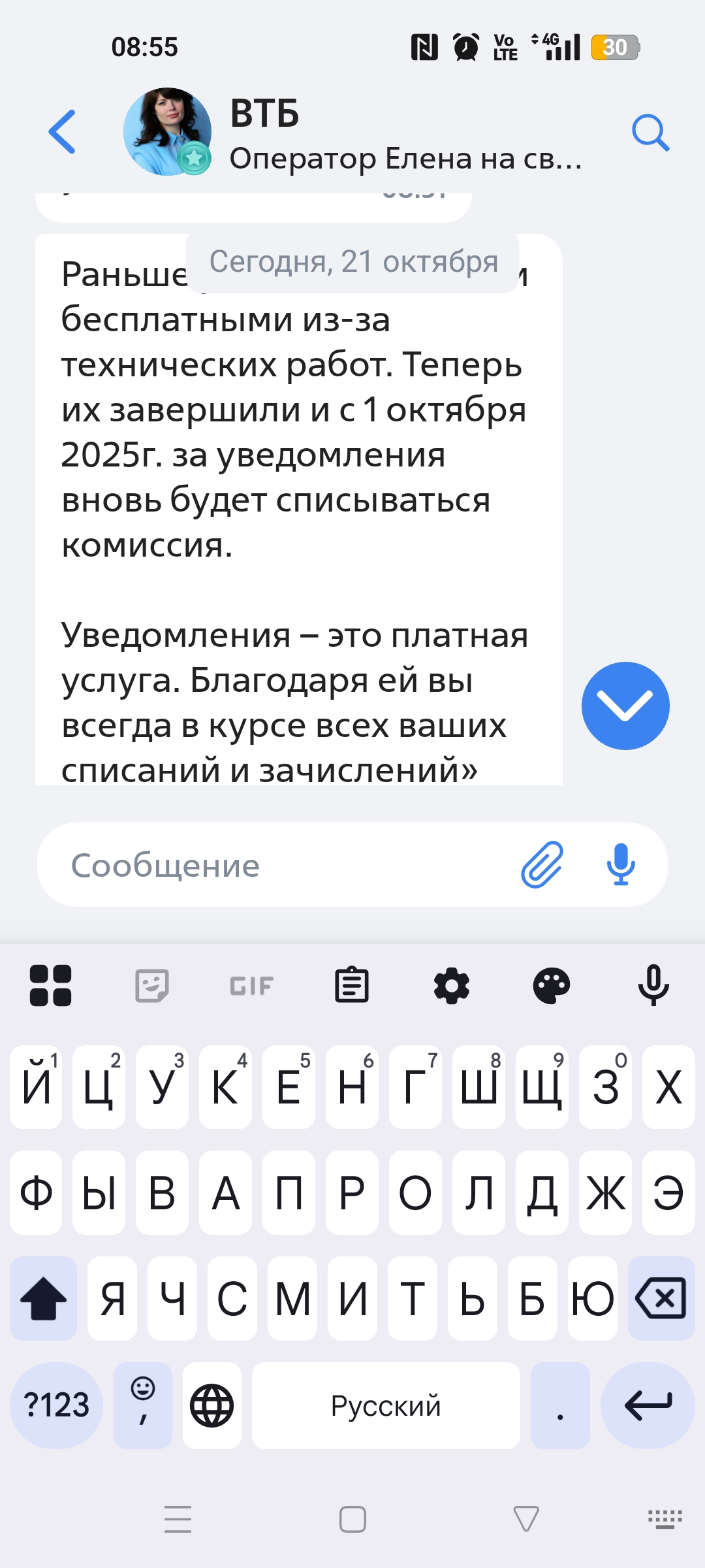 Автор , у меня пакет услуг ,, БАЗОВЫЙ,, ничего не плачу.Все отключено. Основные уведомлениеСМС и ПУШ получаю. Банк вправе , в одностороннем порядке изменять условия тарифа. С 1.10 некотые тарифы изменились, отслеживайте САМИ изменению условий.Вы не указали , в посте, какой именно пакет у вас . На других пакетах и платное и бесплатное или с уменьшеной платой, расширенное уведомление клиента по СМС и ПУШ , в зависимости от категории, клиента - пользователя и выполнении им условий бесплатности ( типа получения зарплаты, пенсии...)по конкретному пакету. ТОЧНУЮ информацию вы можете получить на официальном сайте банка , применительно к своему профилю клиента.