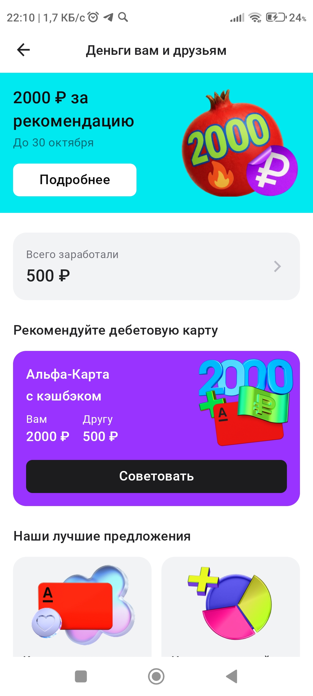 В Альфа❤️-Банке🏦 проходит акция📈, в рамках🖼️ которой вы и ваши друзья🤝 можете получить денежное 💸 вознаграждение🏅. Для этого отправьте📤 реферальную ссылку🔗 вашему другу🤝 или знакомому, чтобы он мог оформить карту💳 по вашей ссылке🔗. При этом банк выплатит вам и вашему другу🤝денежное💸 вознаграждение🏅 за привлечение нового клиента.