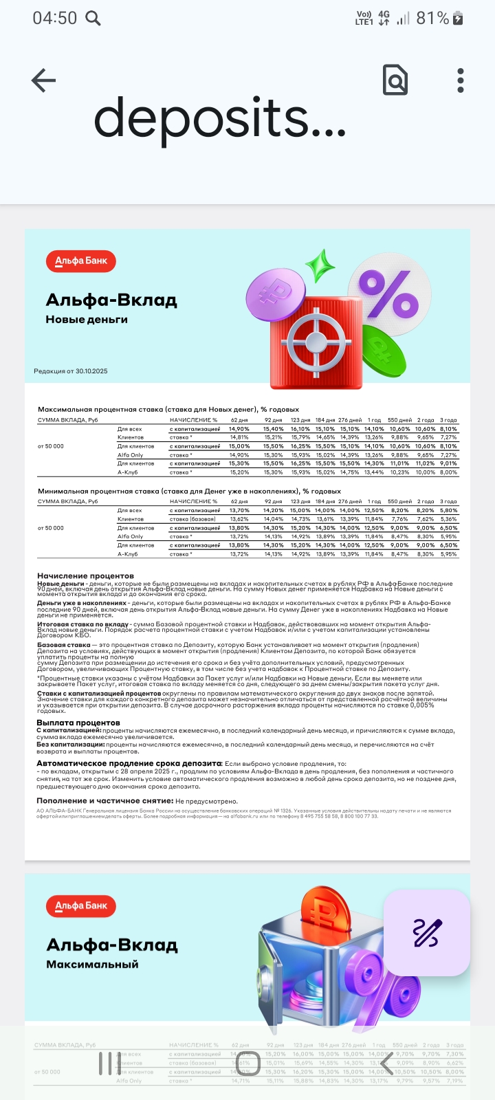 Теперь доходность вклада «Альфа-Вклад. Максимальный» при ежемесячной выплате процентов составляет 6,62–15,69% годовых, а с ежемесячной капитализацией — 7,3–16,01% годовых.