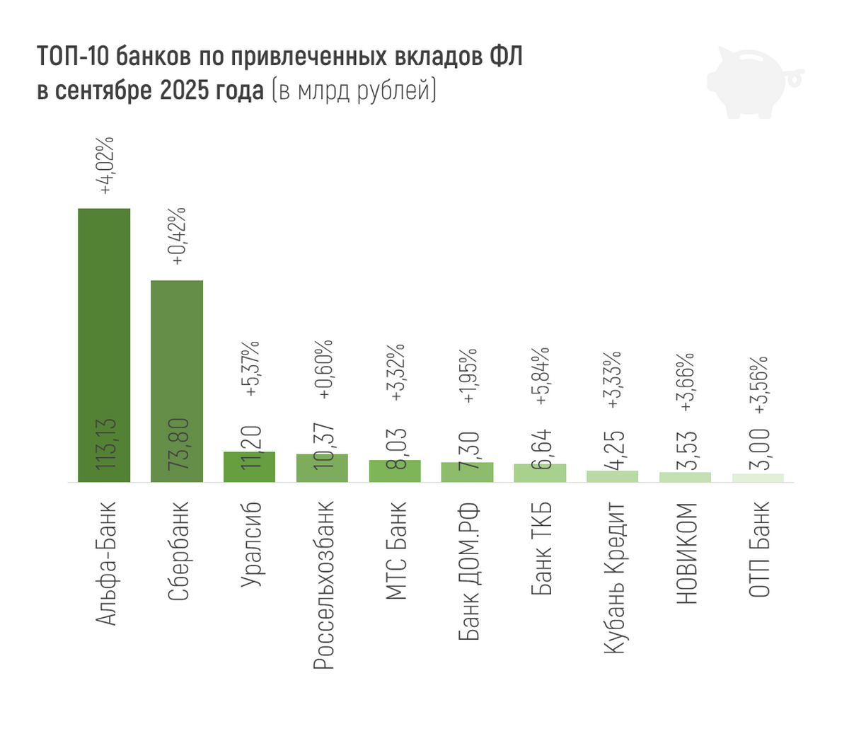В относительном выражении среди сравнительно крупных банков наибольший отток у Кредит Европа Банка (-33,61%, или -44,61 млрд рублей за сентябрь), МТС-Банка (-20,61%, или -37,21 млрд рублей) и РСХБ, а также у Уральского банка реконструкции и развития (-12,32%, или -7,43 млрд рублей).