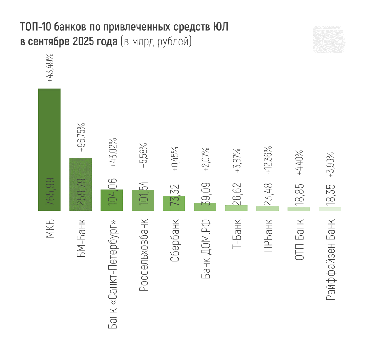 Лидеры сентября по привлеченным средствам юрлиц: Московский кредитный банк, БМ-Банк и Банк «Санкт-Петербург» (+765,99, +259,79 и +104,06 млрд рублей соответственно). Они же лучшие по росту этого показателя в процентном отношении (+43,49%, 96,75% и 43,02% соответственно).