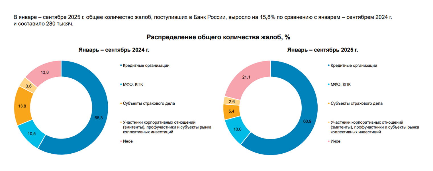 За три квартала 2025 года Банк России принял 170,5 тыс. жалоб на кредитные организации, что на 21% больше, чем за тот же период 2024 года.