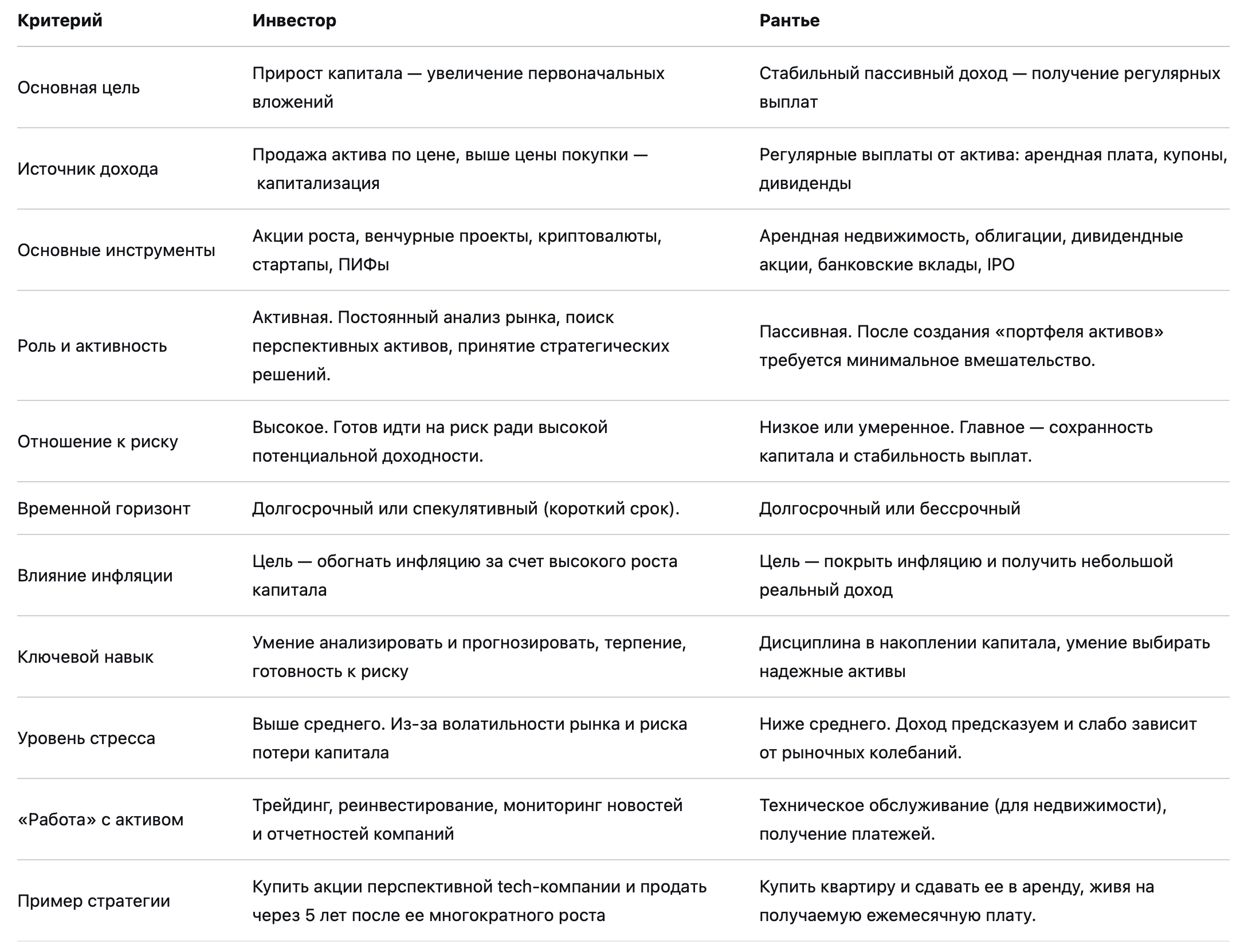Более подробно отличия рантье от инвестора приводим в таблице: