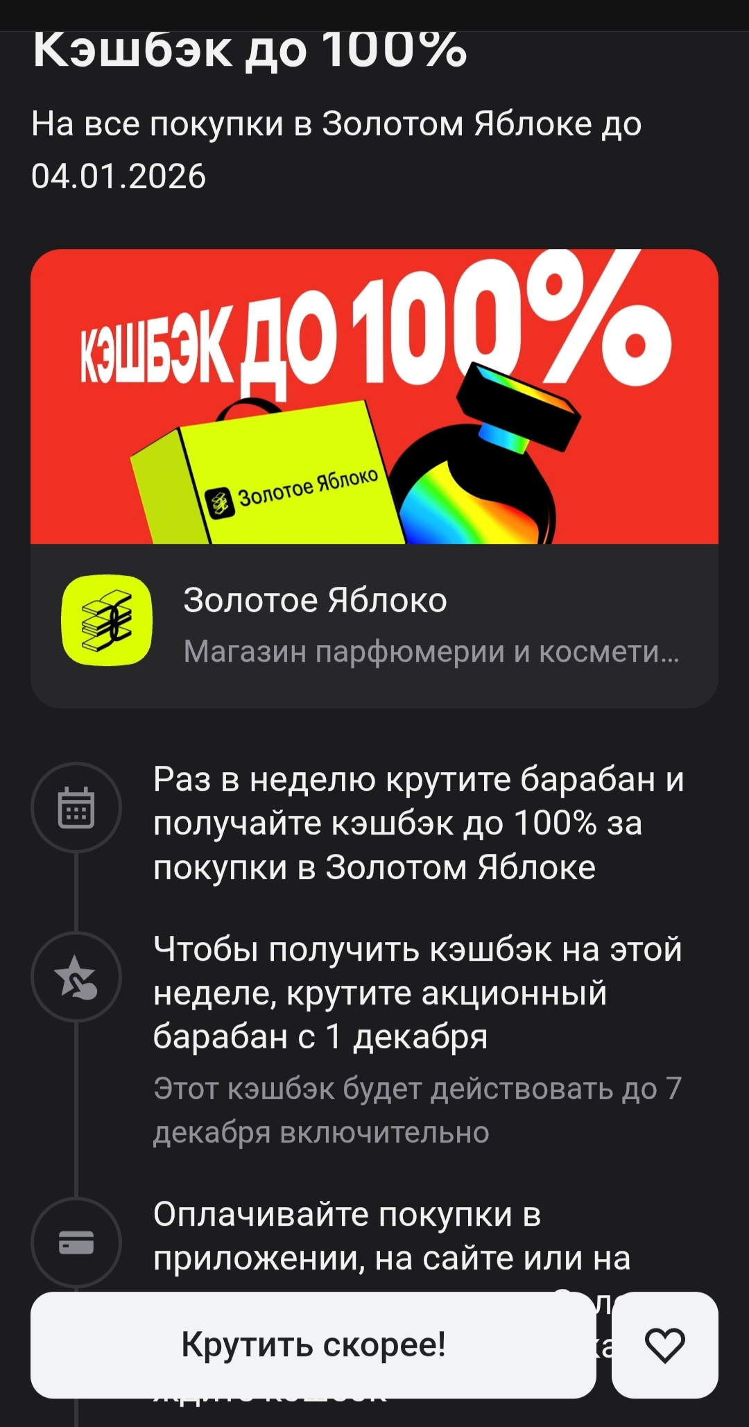 Моя прошлая теория по поводу того что если покрутить в самом начале акции, т.е. в первый день - то выпадет маленькая скидка, разбилась вдребезги. Я покрутили барабан на третий день и выпала все равно ерунда 😁 решила больше не тянуть кота за хвост и узнать, что мне приготовил мой зарплатный банк сразу.