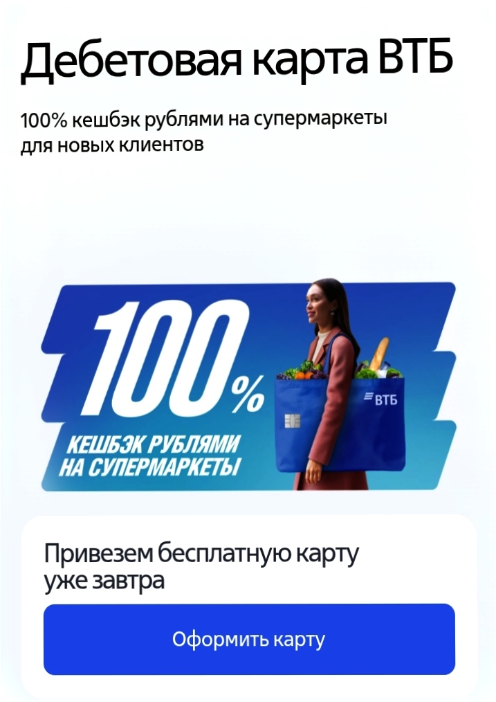 Участвуйте в новой акции ВТБ и возвращайте до 100% за покупки в любимых категориях.До 31.12.2025 года оформите дебетовую карту МИР от ВТБ и получите повышенный cashback рублями. Ставка кешбэка в размере 100% доступна новым клиентам банка при выборе категории "супермаркет "«Максимальный лимит — 1000 рублей.