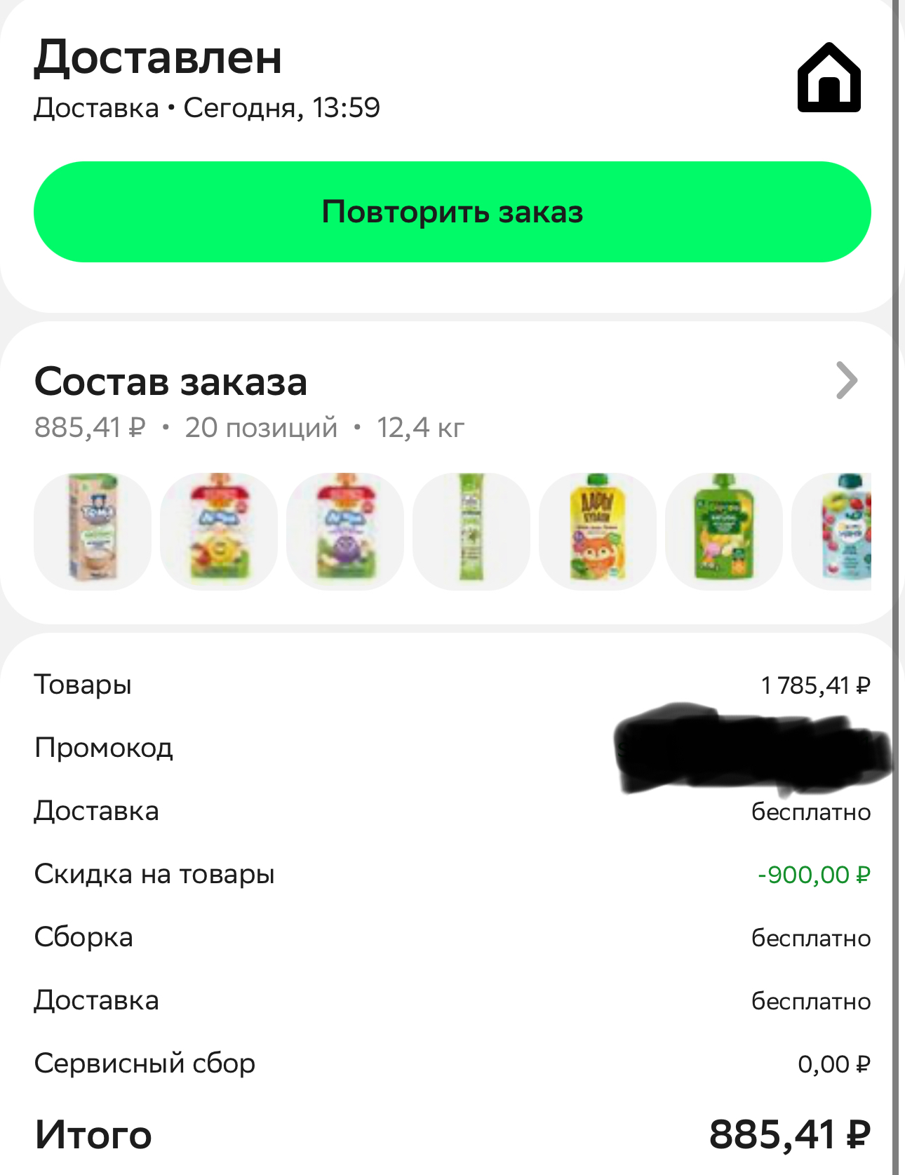 Глазам не поверила, но установила Купер на айфон и быстренько собрала корзину. Ввела промокод, а он не применился (хорошо хоть написали, что надо удалить товары, которые закончились). После удаления этих товаров действительно встал промокод как надо и я получила скидку в 900 максимальных рублей. Я очень довольна! В итоге получилось, что скидка на мою корзину составила 50 процентов. Но если бы корзина была чуть поменьше, то и вышли бы заявленные 75%, т.е. те же 900 рублей.