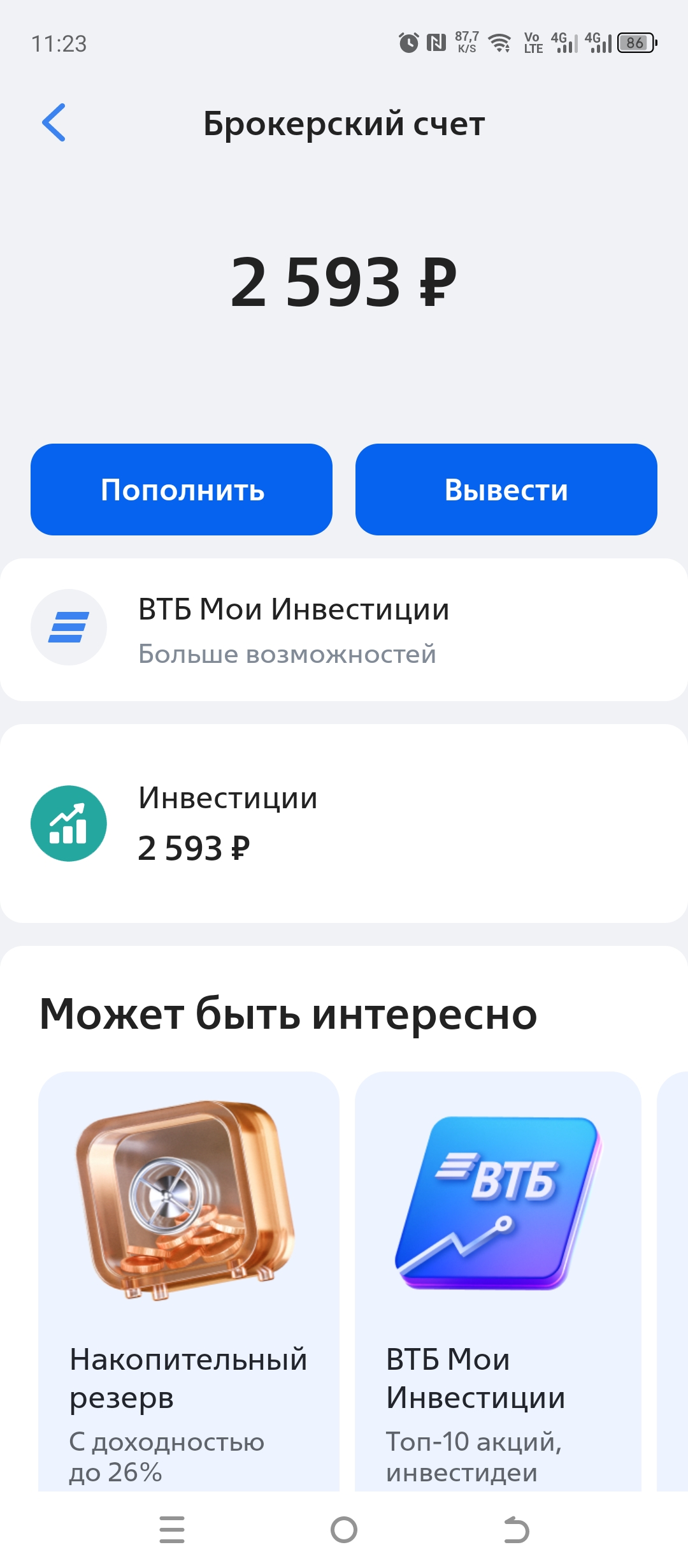 Летом я открыла вклад. Тайный он, потому что узнай о нем муж, считай вклада нет. Не задерживаются у него накопления, спасибо, кстати, последним распродажам. Так вот, произошло это спонтанно, получив деньги с подработки, я увидела предложение от ВТБ. За вклад от 10 000 рублей сроком 4 месяца предлагалось 20 % годовых и 2000 паев золотого фонда. Решила, надо попробовать. И вот сегодня (4 декабря) срок вклада истек. В итоге на счету 10991,77 рублей, а брокерском – 2593 рубля (когда банк зачислил, стоимость паев была около 2100). Маленький финансовый успех!