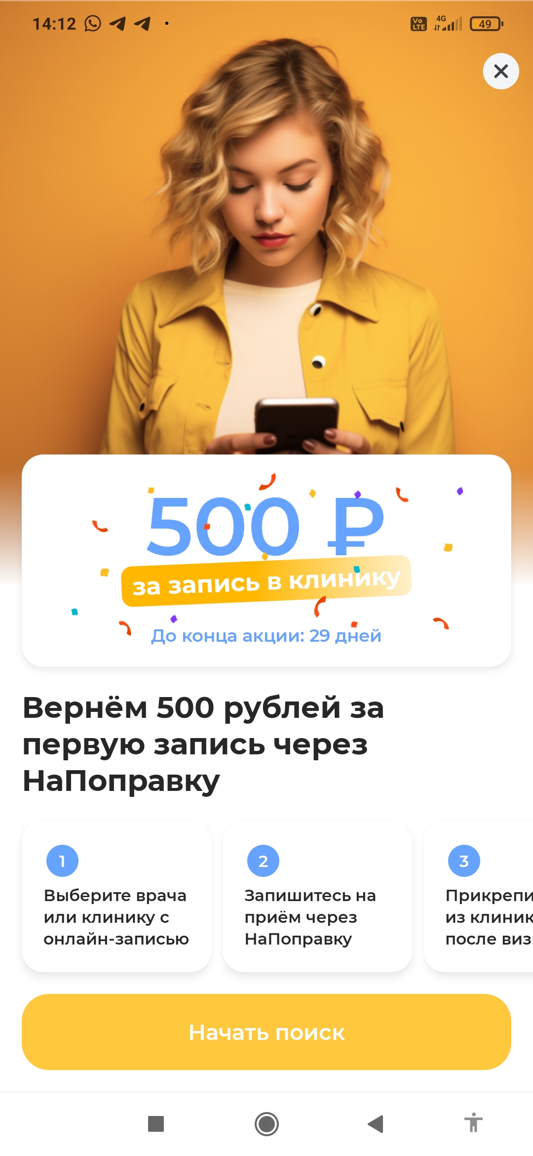 В преддверии нового года захотелось сделать что-то приятное и полезное для своей мамы, решила записать её на консультацию к врачу и на сдачу анализов. В одной из скидочных груп в ТГ прочитала отзыв на приложение Напоправку. Решила скачать приложение и узнать все подробнее. Оказывается, можно вернуть 500р за первую запись через приложение НаПоправку. Нашла нужную мне клинику, врача,записалась на приём, после приёма подтвердила чек и мне действительно за приём вернули 500 баллов (рублей), которые можно потратить на сертификат Озон.
