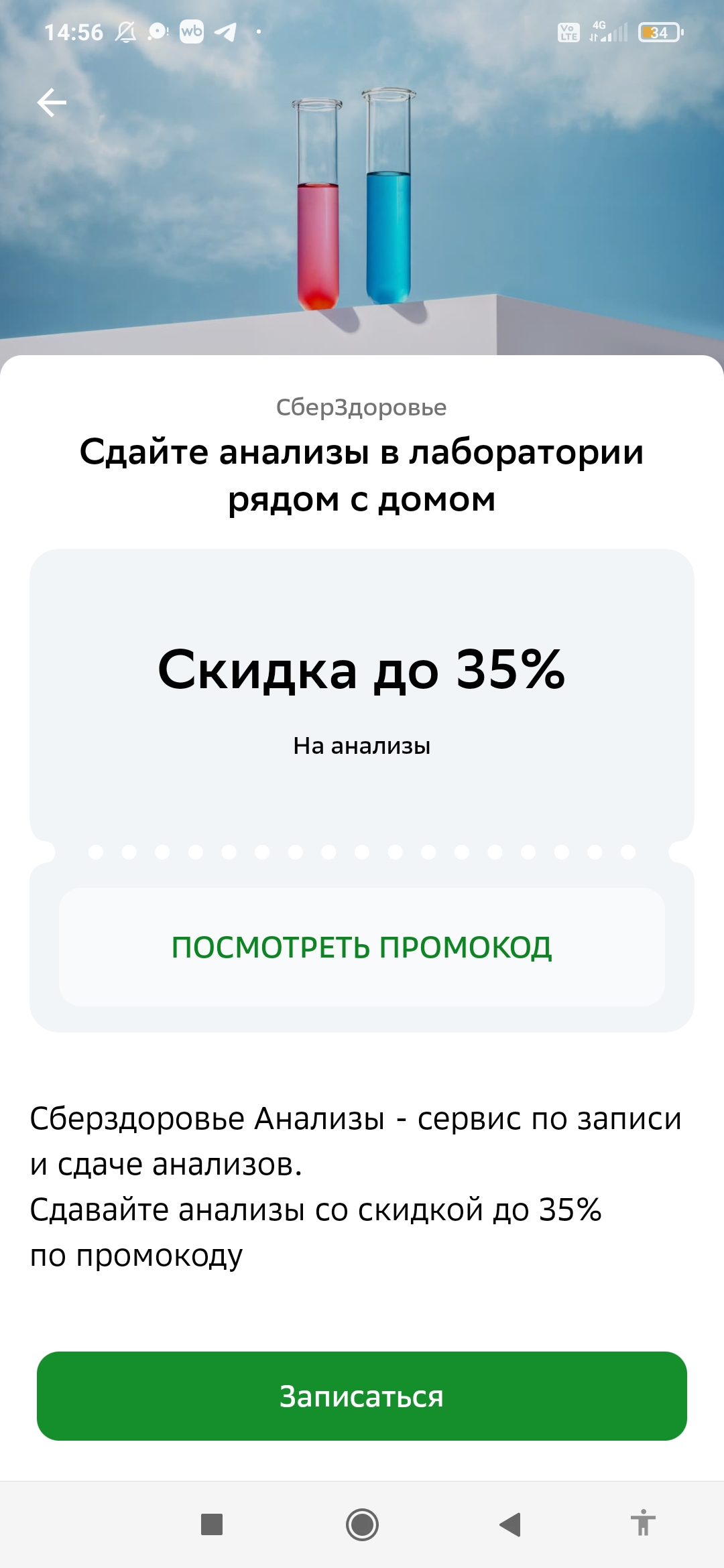 При выборе категории кэшбека в Сбере, увидела что в Сберздоровье акция до конца декабря действует скидка до 35% на анализы по промокоду, который можно найти в личном кабинете.