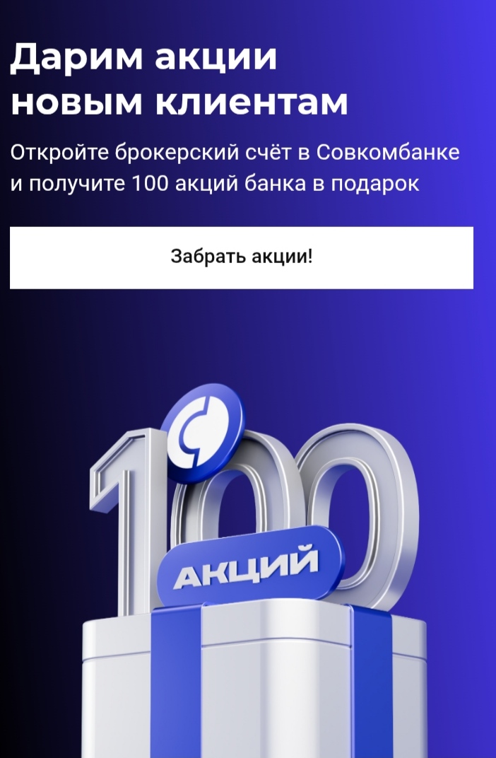 100 акций Совкомбанка (1250₽) за открытие брокерского счёта Если у вас не было брокерского счета в Совкомбанке, за его открытие можно получить 100 акций банка в подарок! Сейчас это примерно 1300 рублей открываем и пополняем брокерский счёт в течение 10 дней на сумму от 10000 не выводим деньги до конца следующего месяца Продаём подарочные акции.Чтобы деньги не лежали без дела, можно купить фонды денежного рынка (комиссия за сделки 0.09%):АКММ от Альфа-Капитала; SBMM от Сбербанка; LQDT от ВИМ...