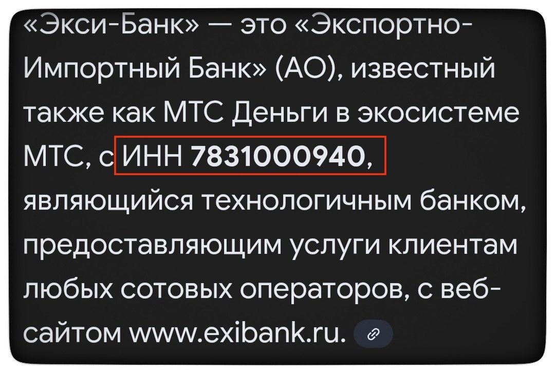 Как уже писала выше, при скачивании приложения у редакции (меня) возник вопрос — какое приложение скачать? Их два. МТС банк, ЭКСИ банк. Пробив по инн выяснилось, что Экси банк — это отдельное юридическое лицо, работающее через экосистему МТС. Карта "МТС Деньги" обслуживается ЭКСИ банком. А вот, карта "Скидка везде" — это продукт МТС банка (красного). Понимаете, где собака зарыта? МТС зарегистрирован в Москве, а ЭКСИ — в Санкт-Петербурге. Людям для снятия блокировок предлагают ехать в Питер.