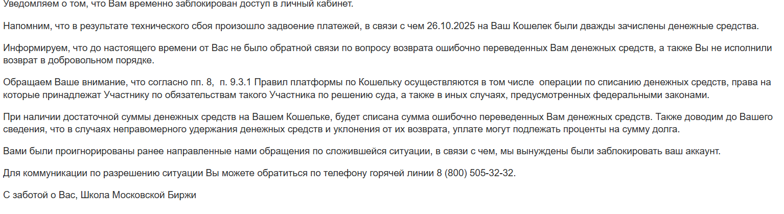 Незаконно заблокировали доступ в ЛК. с формулировкой задвоение платежа 26.10.2025 и что со мной якобы пытались связаться для возврата денежных средств. Я официально заявляю что выплат и писем я не получал . У меня были закрыты досрочно несколько вкладов, я в октябре закрывал только свои вклады. Считаю что блокировка и удержание личных средств не законна . Прошу разблокировать доступ.