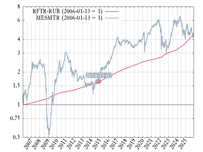 Лучшая иллюстрация боли, которую сейчас испытывают владельцы российских акций — нулевой результат индексного портфеля (MCFTR) относительно безрисковой доходности (3-месячных ОФЗ) за последние 7 лет, а перед этим — еще за 12 лет. Я обычно смотрю соотношение между ними, но тут решил специально нанести их рядом, чтобы подчеркнуть трагизм ситуации: ровный график безриска против бешеной волатильности акций, а результат в итоге одинаковый!