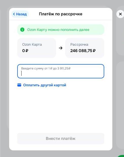 Для погашения рассрочки нужно положить деньги на Озон-карту и нажать кнопку Погасить на рассрочке, ввести нужную сумму и нажать внести платеж.