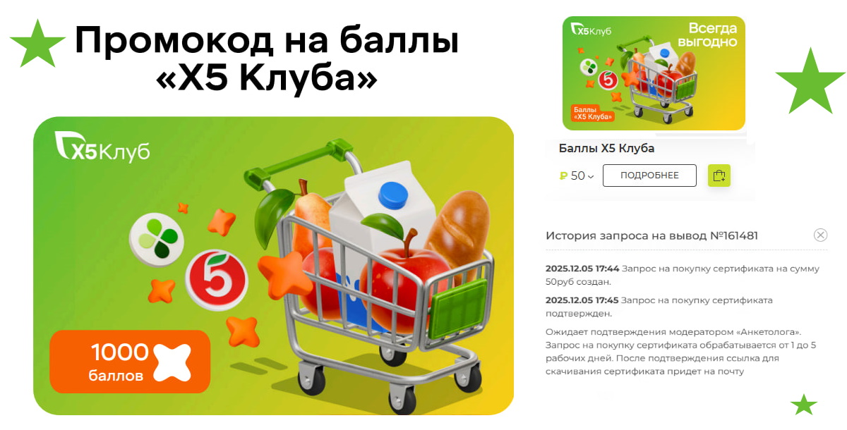Еще один опросник подкинул мне баллы Х5 Клуба - 1500 апельсинок или 150 рублей. Там опросы бывают редко, на минимальную сумму для вывода копить пришлось бы долго. Деньги больше месяца болтались ни туда, ни сюда. А потом увидела, что можно обменять на сертификаты для Х5 Клуба и у тут же воспользовалась ситуацией. Сертификаты пришли на почту, ввела их в приложении Пятерочки и почти сразу баллы отобразились на счету.