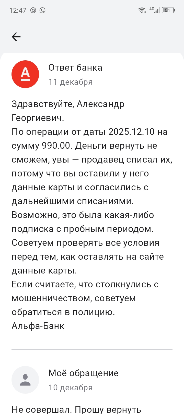 Но, спустя несколько недель, вчера, 10.12.2025, обнаружил в приложении Альфа - банка списание 990 руб. за подписку от этого сервиса. Сказать, что я был в шоке- это ничего не сказать! Обратился в банк и оператор составила обращение по возврату несуществующей услуги, а также заблокировала карту списания. Сегодня, 11.12.2025 г., получил от банка ответ о невозможности возврата денег. Принял это как должное...