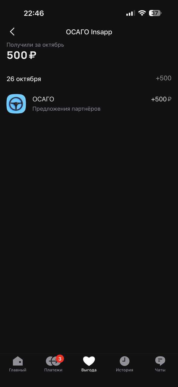 В конце октября оформил полис ОСАГО через приложение Альфа банка и приятным бонусом стало начисление вознаграждения в размере 500 рублей от Альфа или одного из его партнёров. В моём сознании - это бонус от Альфа банка.