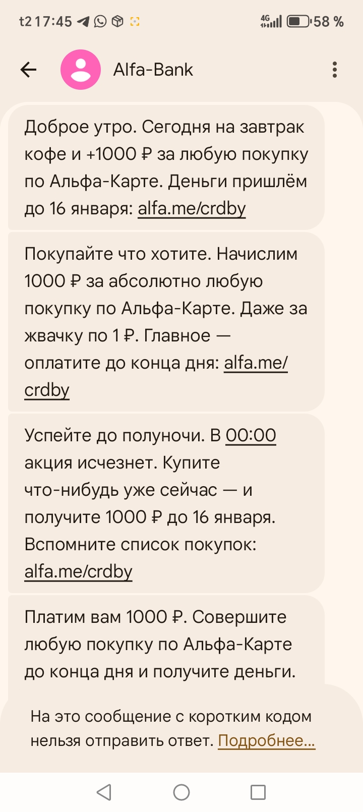 Это персональное предложение, потому что муж у себя такого не обнаружил. Тем не менее, друзья, от всей души предлагаю вам внимательно изучать все бесконечно - многочисленные предложения, которые АЛЬФА-БАНК дарит нам в эти предновогодние дни особенно щедро. Деньги на карту будут зачислены до 16 января.
