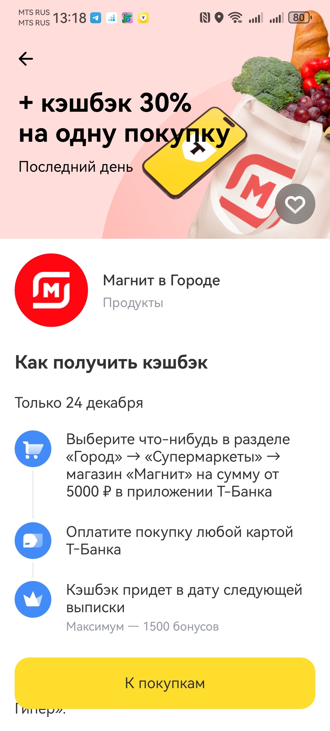Если Вы ещё не закупились в «Пятёрочке» («Перекрёстке», «Самокате» и пр.), сегодня можно заказать продукты и товары первой необходимости в «Магните» с огромной выгодой от Т-Банка.
