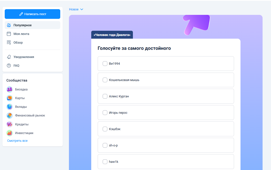 Мы собрали шорт-лист из 25 претендентов на звание «Человек года Диалога» и уже запустили голосование в разделе «Популярное»: https://www.banki.ru/dialog