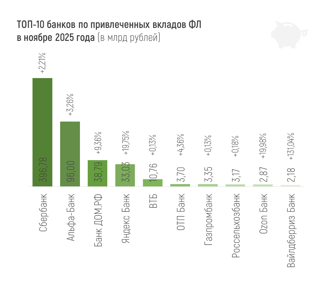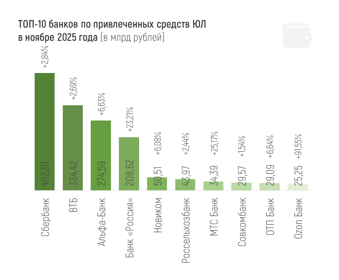 Лидеры ноября по привлеченным средствам юрлиц: Сбер, ВТБ и Альфа-Банк (+462,1, +334,4 и +274,6 млрд рублей соответственно). По росту этого показателя в процентном отношении среди крупных банков лучшими оказались Банк «Россия», МТС Банк и Ozon Банк (+23,21%, +25,17% и +91,55% соответственно).