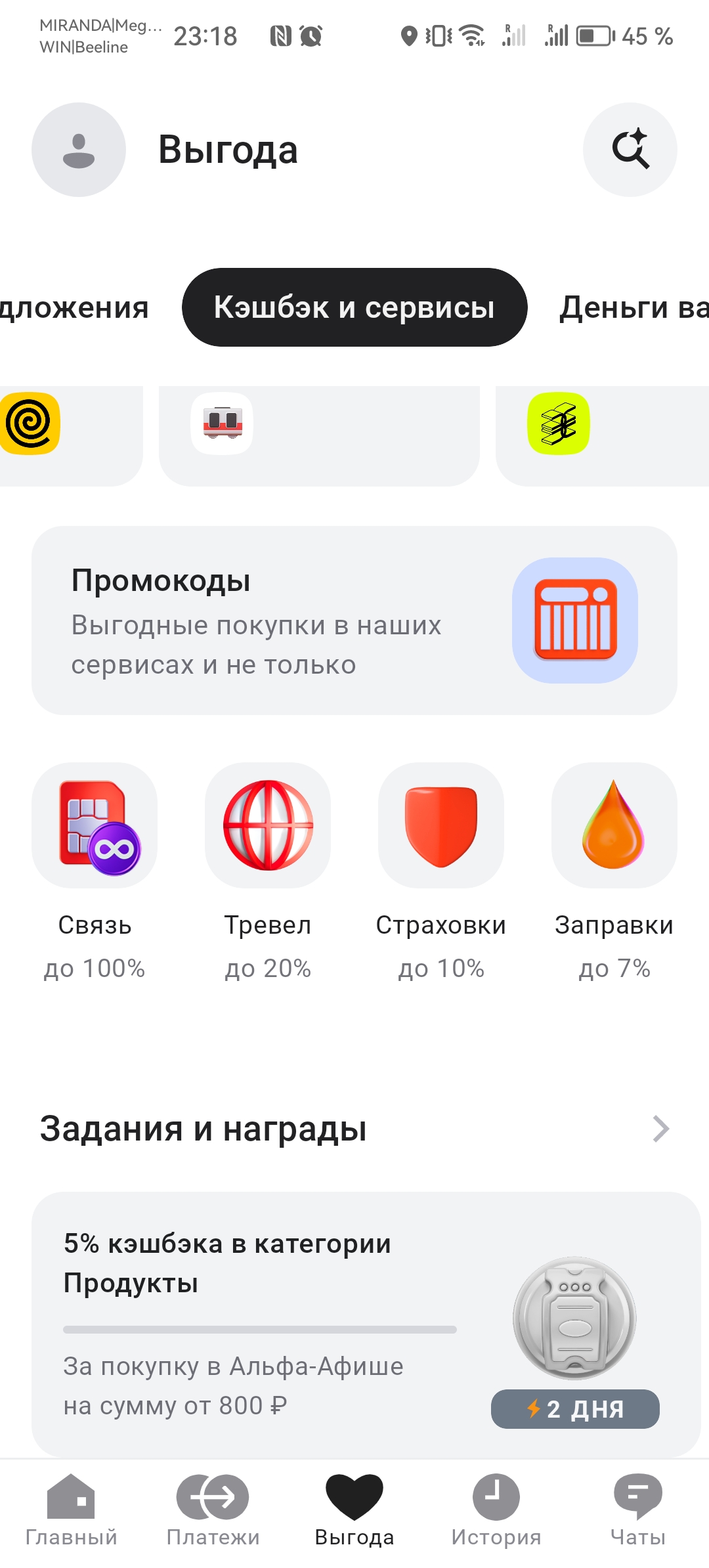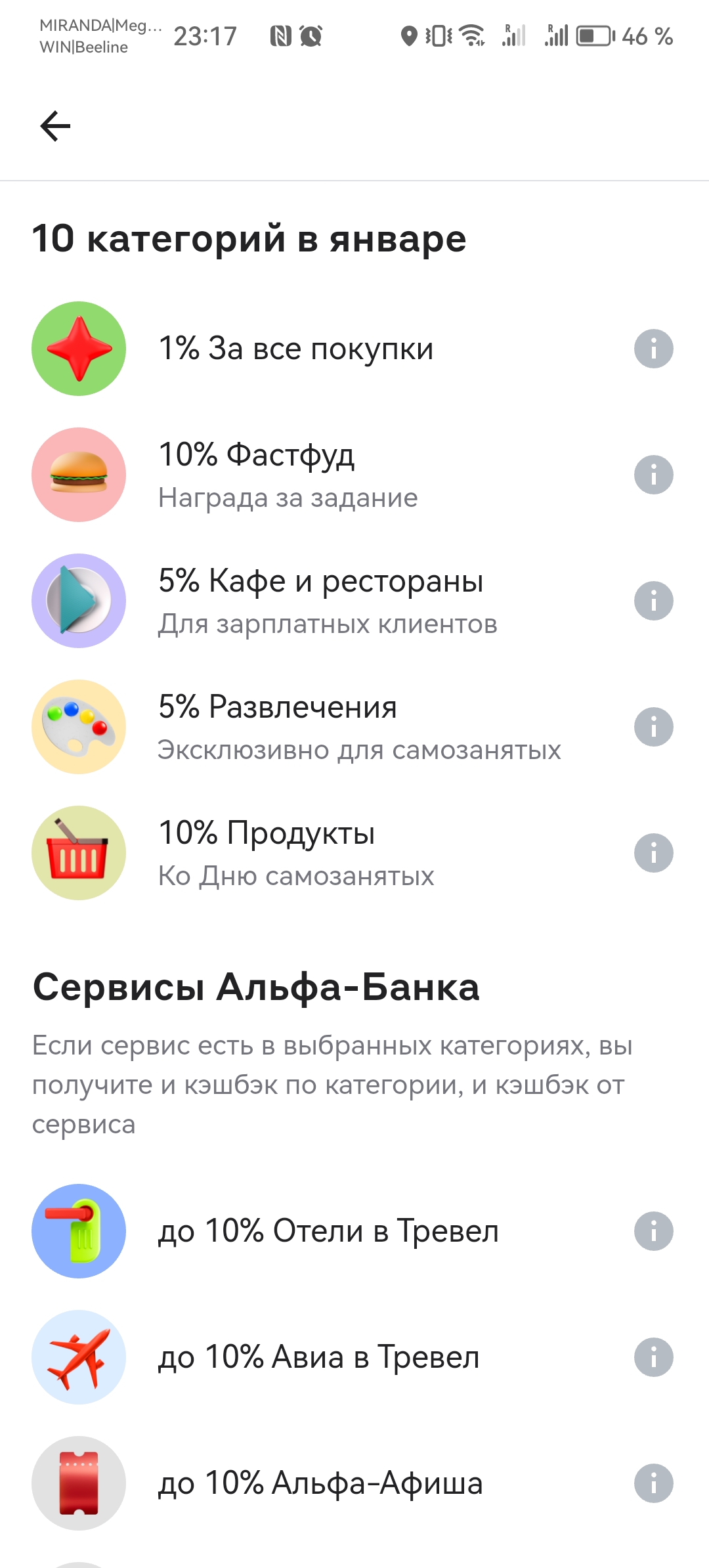 Все плюсы своей карты расписывать не буду (бесплатное обслуживание, бесплатные платежи и снятие наличных в любых банкоматах и т.д.), ибо это можно сделать отдельной темой для следующей статьи, остановлюсь исключительно на некоторых фишках в части кэшбэка. Помимо тех категорий кэшбэка, которые вы ежемесячно выбираете из предложенных (3-4 из примерно 10, в зависимости от того, являетесь ли вы зарплатным клиентом банка, самозанятым и т.п.), также есть 5 категорий кэшбэка на сервисы от банка (отели, авиа, ж/д, афиша, заправки - могут меняться). Но и это ещё не всё. Каждый месяц у вас есть возможность раскрутить барабан суперкэшбэка, где рандомно может выпасть любая категория и любой лимит (вплоть до 100%). Кроме того, в разделе "Задания и награды" мобильного приложения банка можно выбрать те задания, которые вы понимаете, что сможете выполнить в течение заданного времени (как правило, месяц), например, потратить 40000 рублей за месяц или совершить покупки в 10 различных категориях и т.п. За выполнение заданий вам на следующий месяц будет дополнительно добавлена призовая категория кэшбэка в качестве награды. В качестве подтверждения прикрепляю скриншоты своих категорий на январь 2026 года, а также для примера виды заданий, которые у меня сейчас активированы.