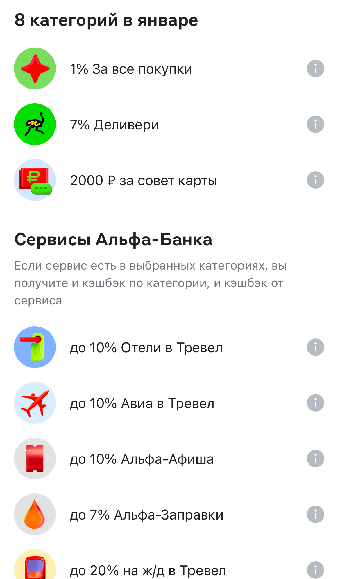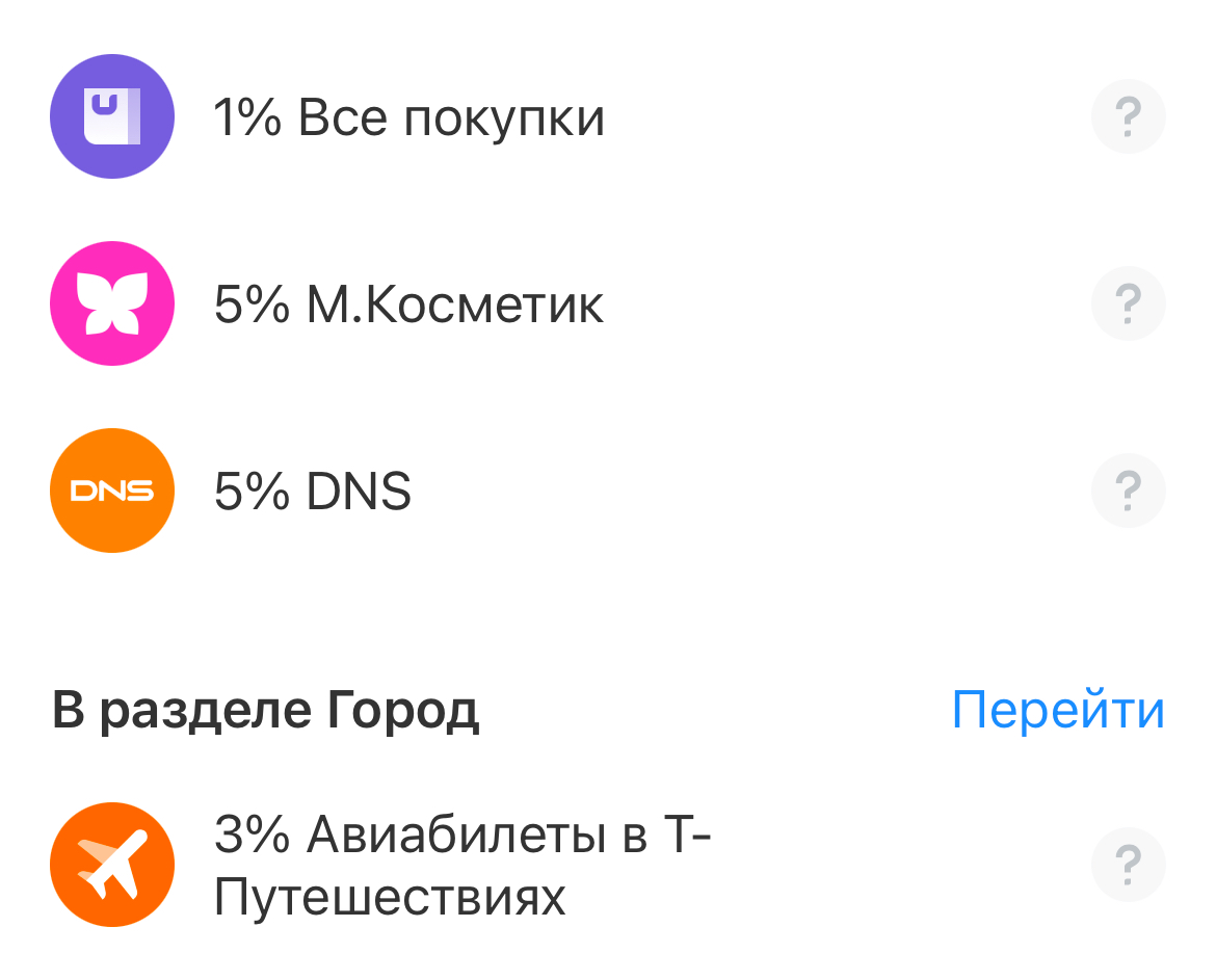 У всех этих банков бывают дополнительные предложения по кэшбеку и скидки от партнеров. Например, в Тбанке и Альфе — по Самокату, супермаркетам(Дикси, Магнит, Перекресток и тп), определенным кафе, своим сервисам для поездок