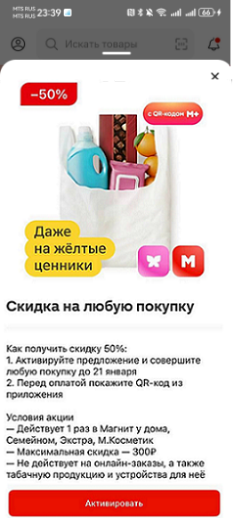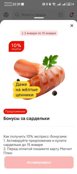 Но нужно и в «Предложения для вас» заглядывать. Например, предложили купить продукты с 50%-ным кешбэком даже на товары по жёлтым ценникам до 21 января с максимальным бонусом 300 ₽. Можно что-нибудь нужное купить в «Магнит Косметик».