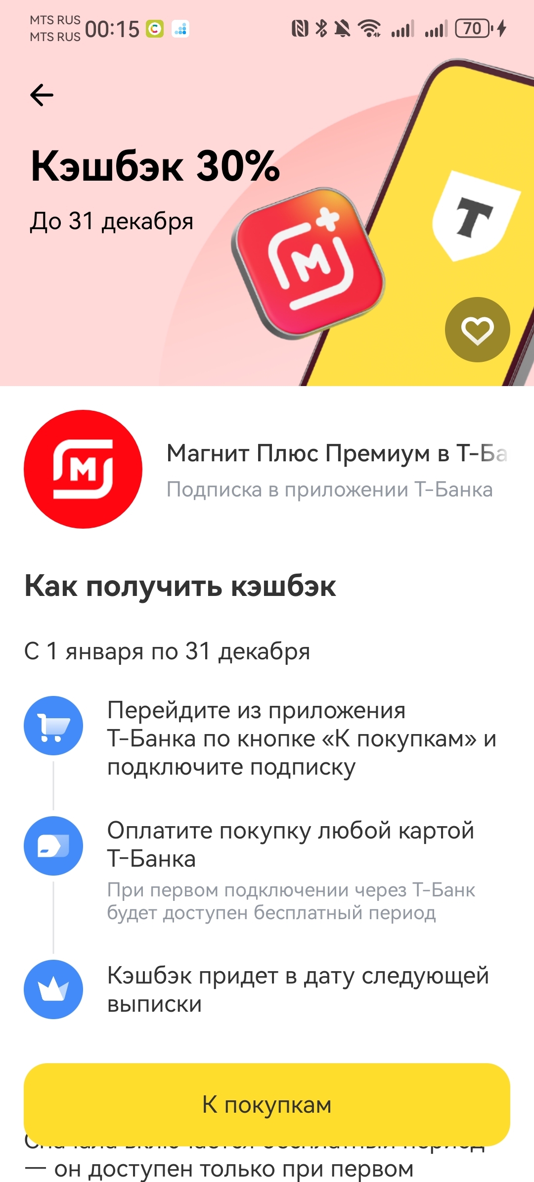 Кстати, в Т-Банке до конца года 30%-ный кешбэк на подписку «Магнит Плюс Премиум».