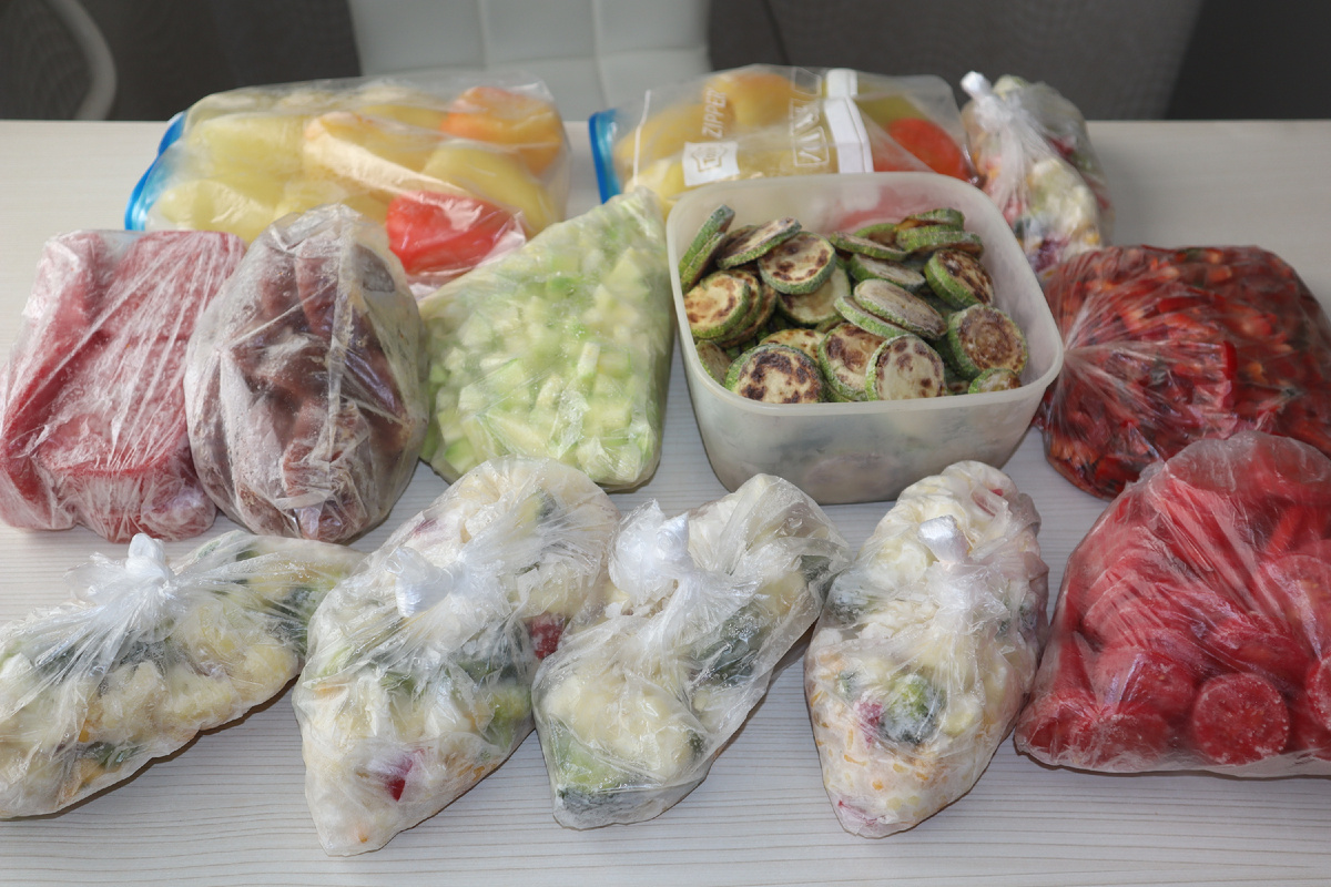 Что касается заморозки, то здесь я обязательно делаю овощные смеси — брокколи, цветную капусту, кукурузу, болгарский перец. Я очень люблю такие заготовки: они полезные, вкусные и снова же помогают экономить, ведь летом овощи стоят значительно дешевле, а часть из них и вовсе выращивается на огороде. В моей морозильной камере шесть ящиков, и два из них полностью заняты именно овощными смесями.