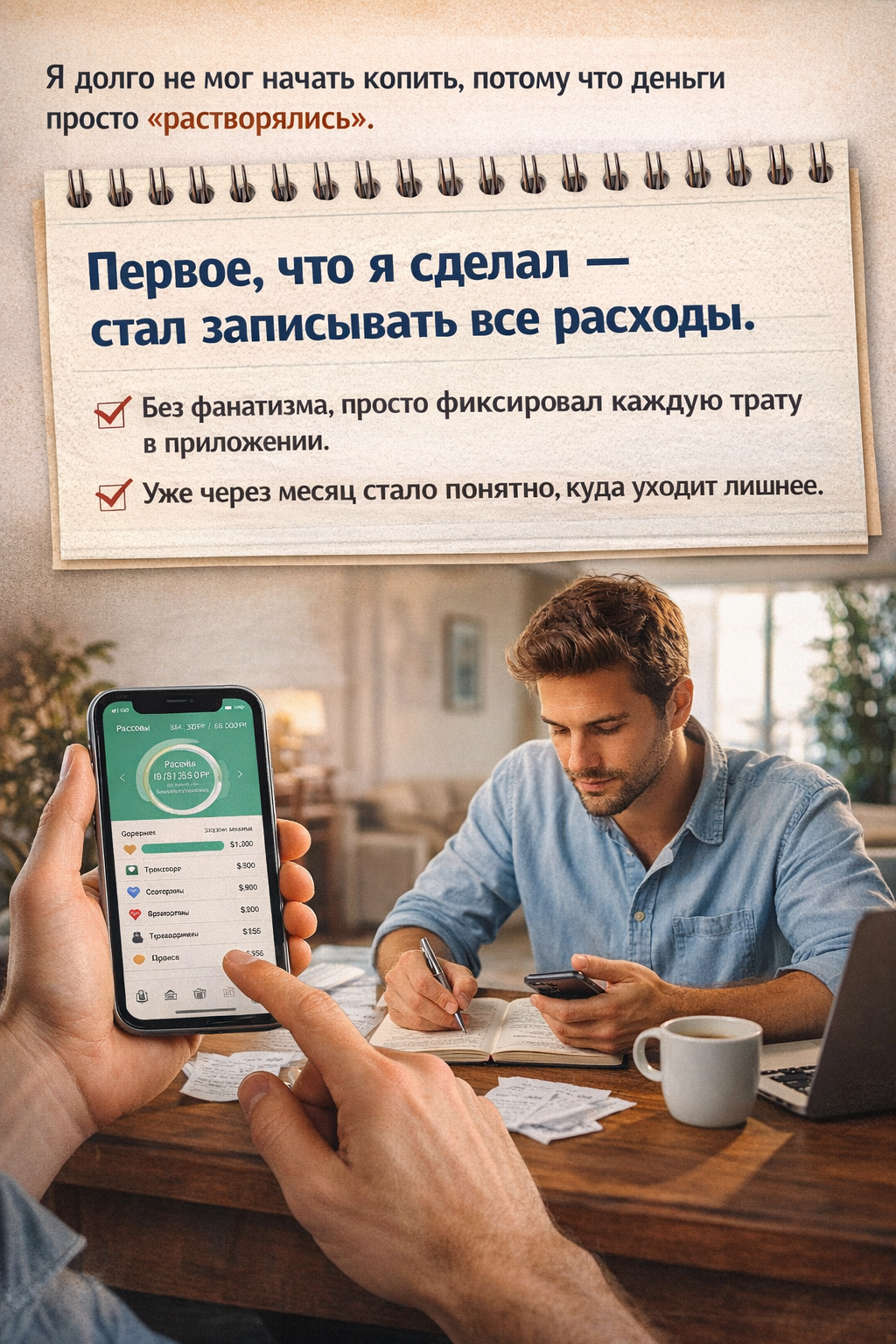 Я долго не мог начать копить, потому что деньги просто «растворялись». Первое, что я сделал — стал записывать все расходы. Без фанатизма, просто фиксировал каждую трату. Уже через месяц стало понятно, куда уходит лишнее.