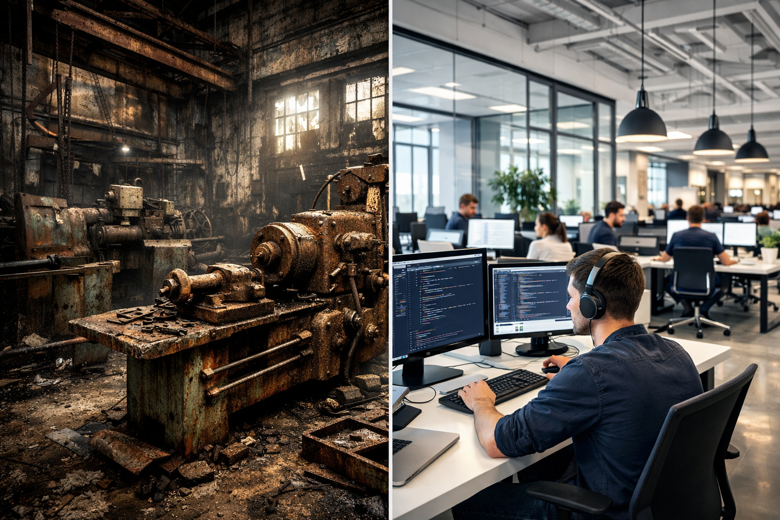 Деиндустриализация — это долгосрочное снижение доли промышленности в экономике страны. Рабочие места и ВВП перетекают из производства (заводы, фабрики) в сферу услуг (IT, финансы, кафе).