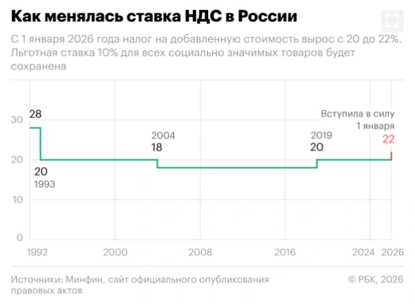 В 2019 году ставку повысили до нынешних 20%, а с 2026-го НДС составляет 22%.