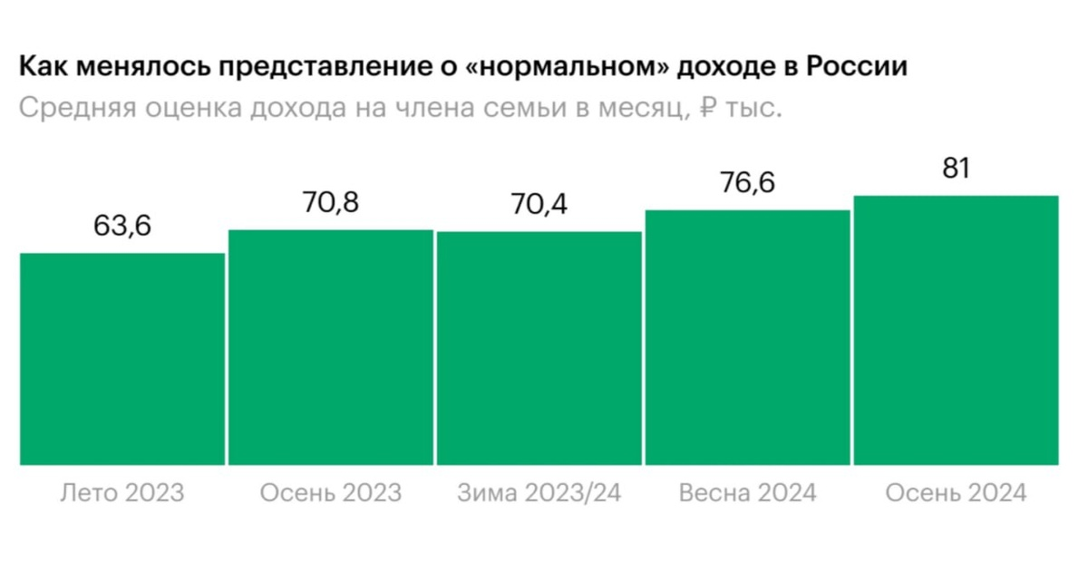 📈 Этот опрос проводится ежегодно, и по сравнению с предыдущим годом сумма подросла на 14% (тогда было 70,8 тысячи). Если же брать не среднее, а медианное значение (то, что делит опрошенных пополам), то рост ещё круче — сразу на 20%, до 60 тысяч рублей. На первый взгляд, это реакция на инфляцию. Но если присмотреться к данным «Барометра экономического поведения домохозяйств», вскрывается целый пласт интересных социальных и психологических нюансов.
