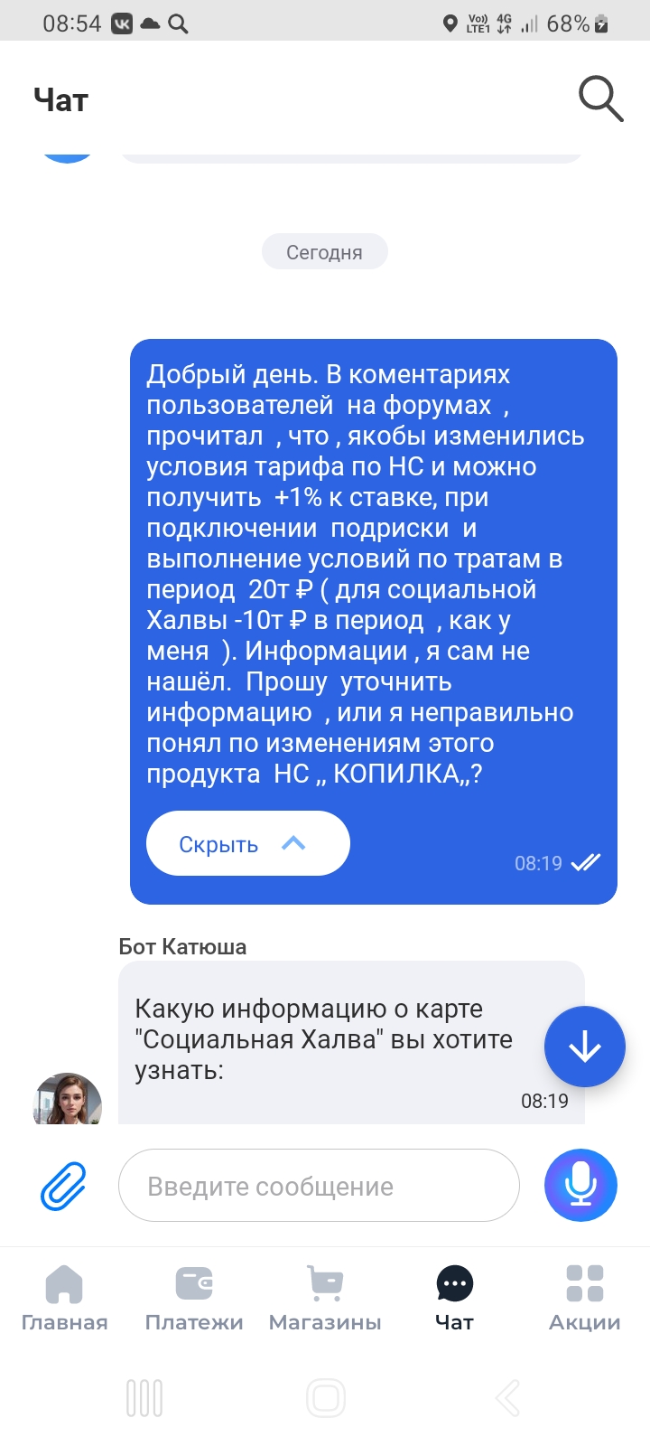 Хочу поделится информацией, в данном посте, с пользователями Диалога о предстоящих изменениях по условиям тарифа продукта НС ,, КОПИЛКА,, Судя по коментариям и постам , многие пользователи уже пользуются Совкомбанком , некоторые очень успешно , а некоторые клиенты, судя по описанию, ситуаций не очень. Сам; активно, пользуюсь услугами этого банка и НС ,, Копилка,, - Мой карманный финансовый 👛 . Итак , получил , сегодня подтверждение сотрудника в Чате , что с 18.01.2026г будут изменениях по этому счету в банке. А , именно , появится возможность УВЕЛИЧИТЬ % ставку , при подключении подписки и выполнению оборота по карте ,, ХАЛВА,, для клиентов- 20т ₽ в период , По социальной карте тарифа ,, ХАЛВА,, - 10т ₽. Останусь доволен , если моя информация будет полезной.