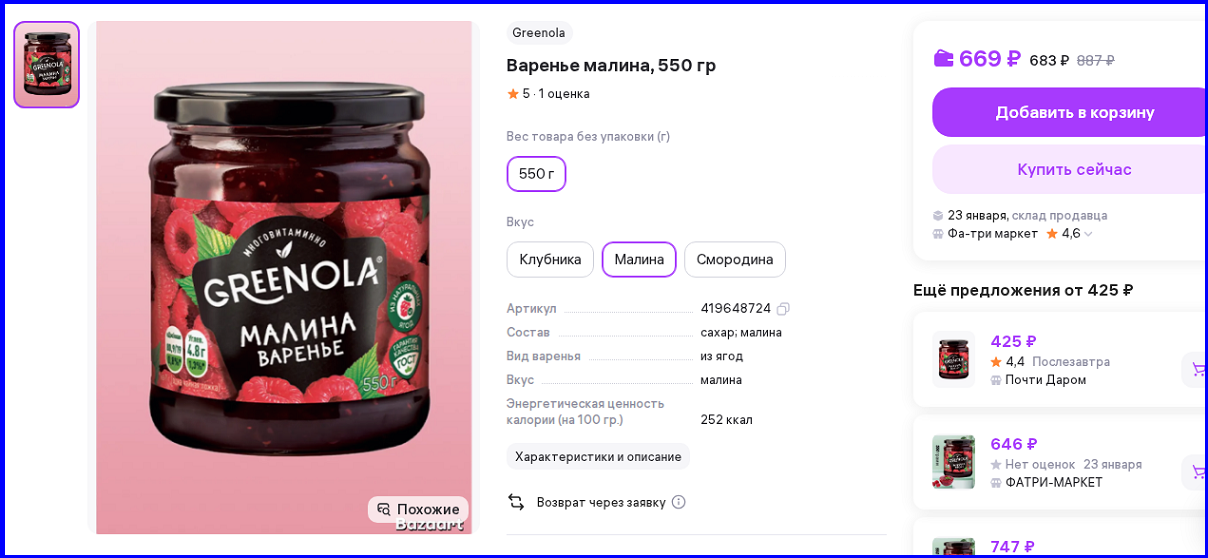 На Озоне баночка малинового варенья GREENOLA стоит 435 ₽ (за пару надо заплатить 870 ₽, кстати, с Озон-Банком, а по любой другой карте - 968 ₽)