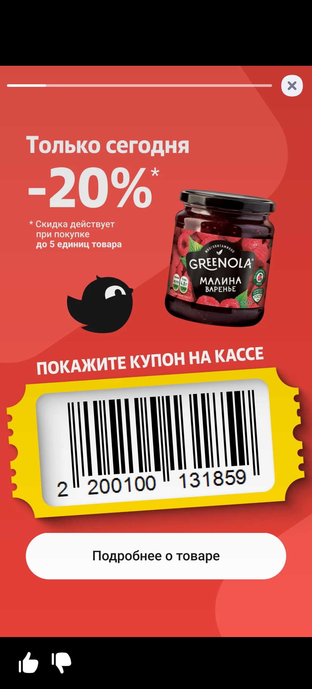 Только сегодня малиновое варенье GREENOLA можно купить в «Чижике» по 151,2 ₽ вместо 189 ₽. Баночки по 550 граммов, надолго хватит. На один купон продадут до 5 баночек.