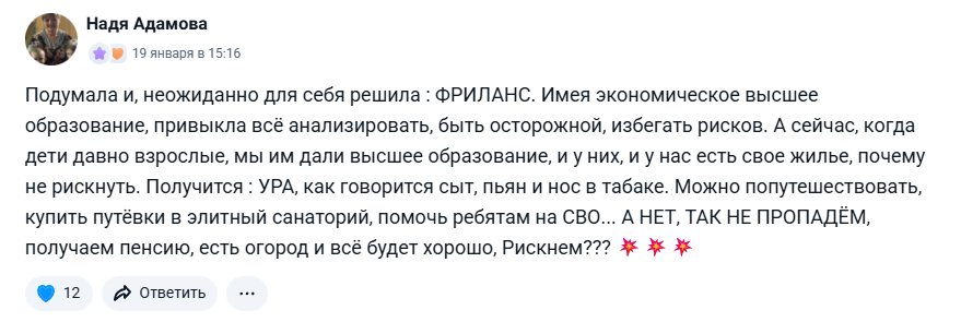 Надя Адамова поделилась неожиданно светлым и вдохновляющим взглядом на фриланс — взглядом человека, который уже достиг устойчивости и может позволить себе свободу. Отдельное личное спасибо за фразу «сыт, пьян и нос в табаке» — беру её в оборот 😅