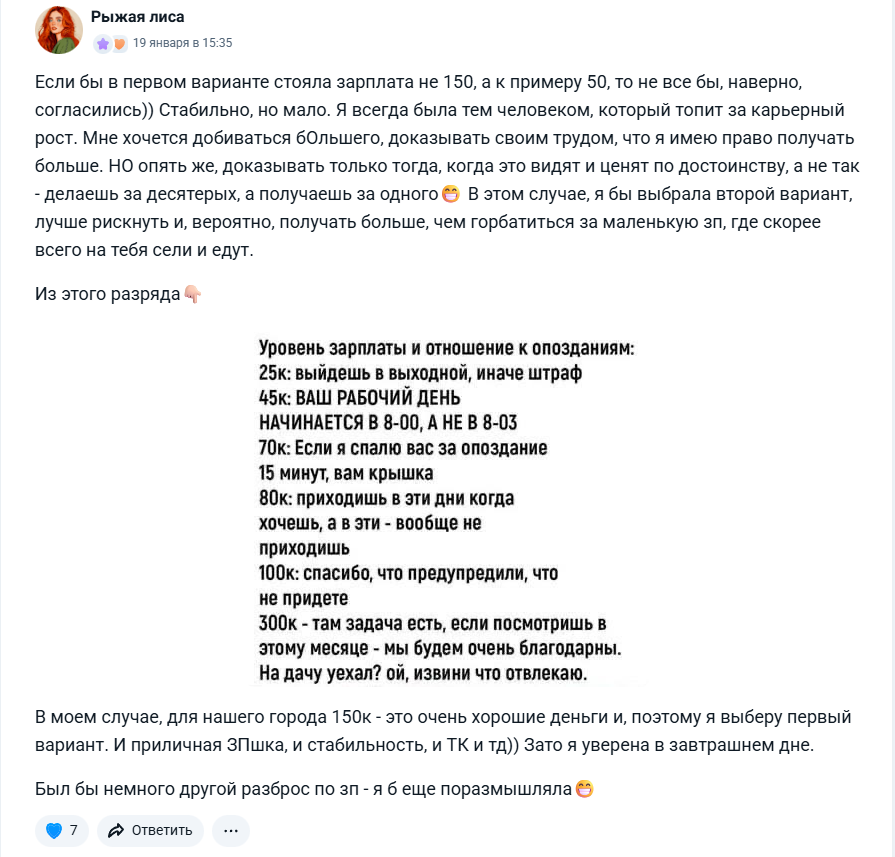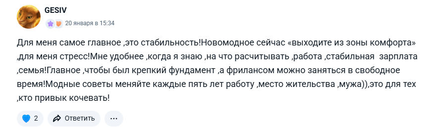 Спасибо всем, кто включился в мою небольшую активность! Мы обсуждали, что выбрать — стабильность или свободу, и комментарии превзошли все ожидания. Было множество вдумчивых, честных, иногда философских мнений.