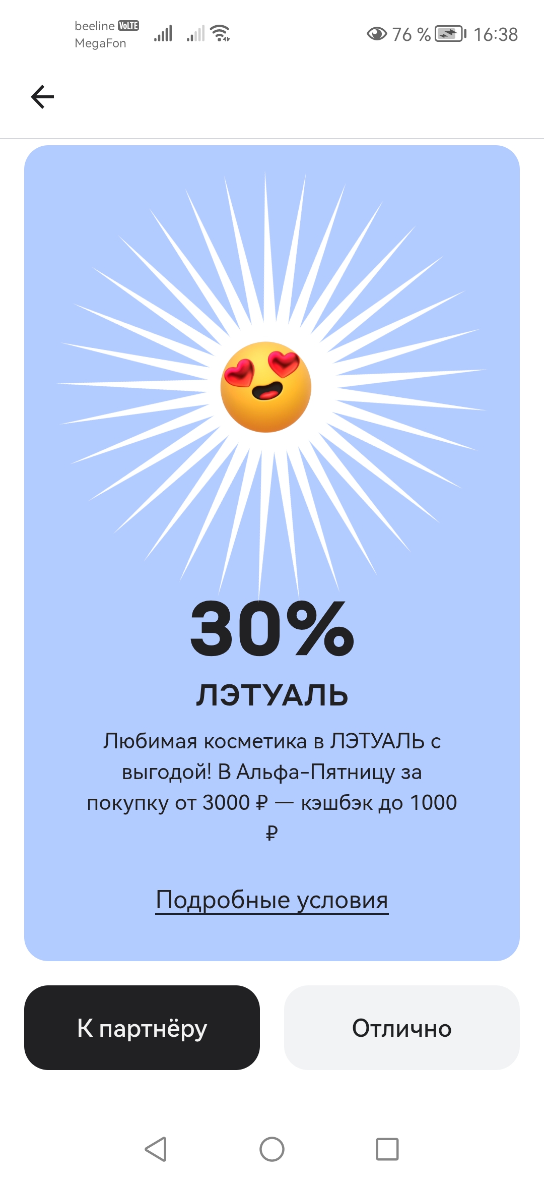 Мне достался кэшбек 30% на покупку от 3000 рублей (в приложении, на сайте при онлайн заказе или на кассе в оффлайн - магазине Лэтуаль ). Максимальный кэшбек у меня 1000 рублей.