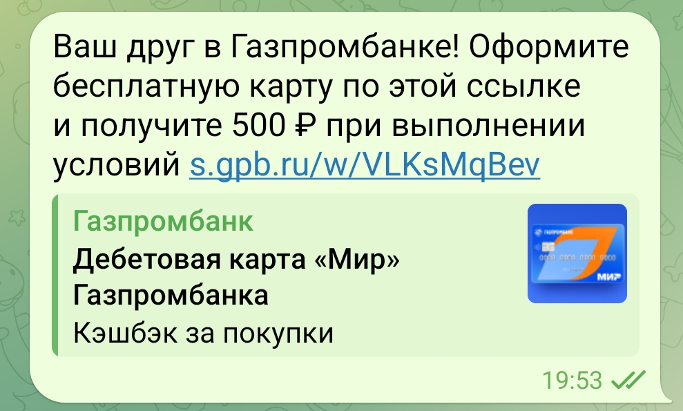 Хочу поделится историей. Своих наблюдений. Один человек прислал мне ссылку на оформление дебетовой карты газпромбанка. Я эту карту оформил специально по его ссылке. Газпромбанк в этом случае обещал мне 500 рублей а другу 1000.